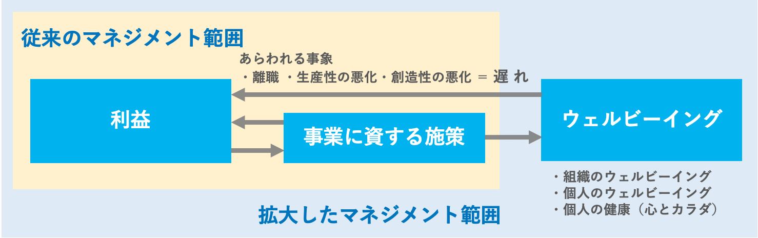 ウェルビーイング経営は、企業の中にある見えない資本である「ウェルビーイング」を活用した新しい経営手法。これをいかにマネジメントの範囲に盛り込み、企業経営に生かしていくかがウェルビーイング経営の目指すところです。