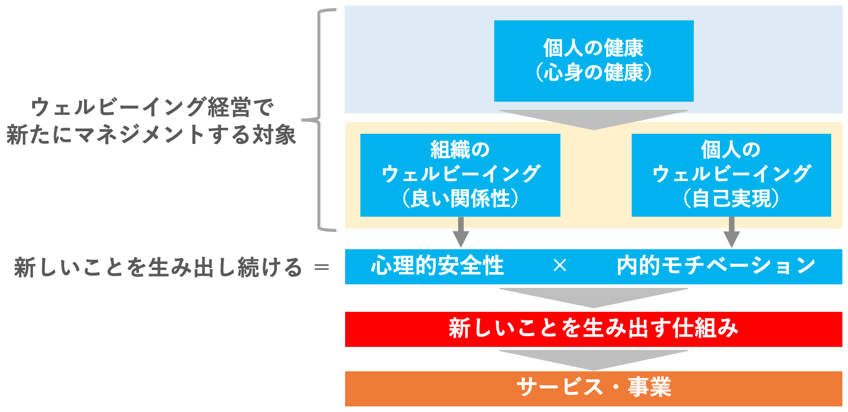 心理的安全性や内的モチベーションが高まると、新しいことを生み出す可能性が増えてきます。ただ、これが新しいことを生み出す仕組みに繋がっていないと、結果的にサービスや事業に結びつきません。環境を整えるだけでなく、予算や時間をつけるなど新しいサービスや事業につなげる仕組みをつくらないと成果が出てこないのも、ウェルビーイング経営の特徴と思っています。