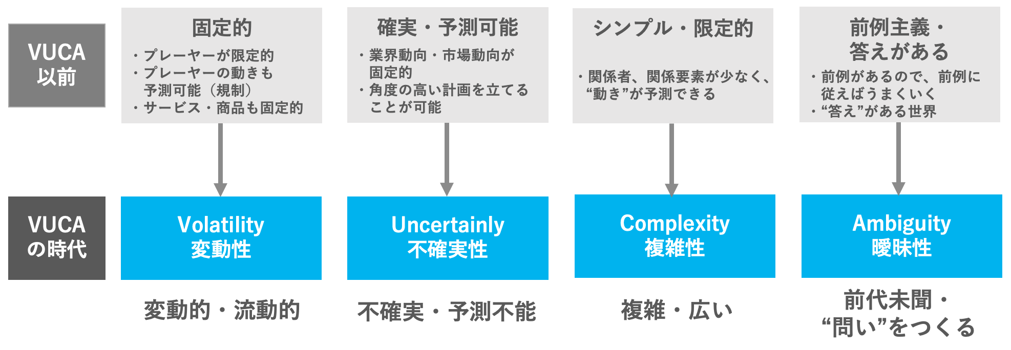 VUCA(ブーカ)とは、“固定”的だった社会が“流動”的になった社会のこと。「VUCAの時代」と言われて久しいですが、今もその状況は続いています。