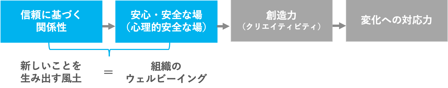 心理的安全性とは、一般的には信頼に基づく関係性ができている、自分がそこにいて自分の不利益が起きないこと。そういった環境下では自由にいろんな意見が出て、議論をしながら新しいことを生み出す土壌ができます。